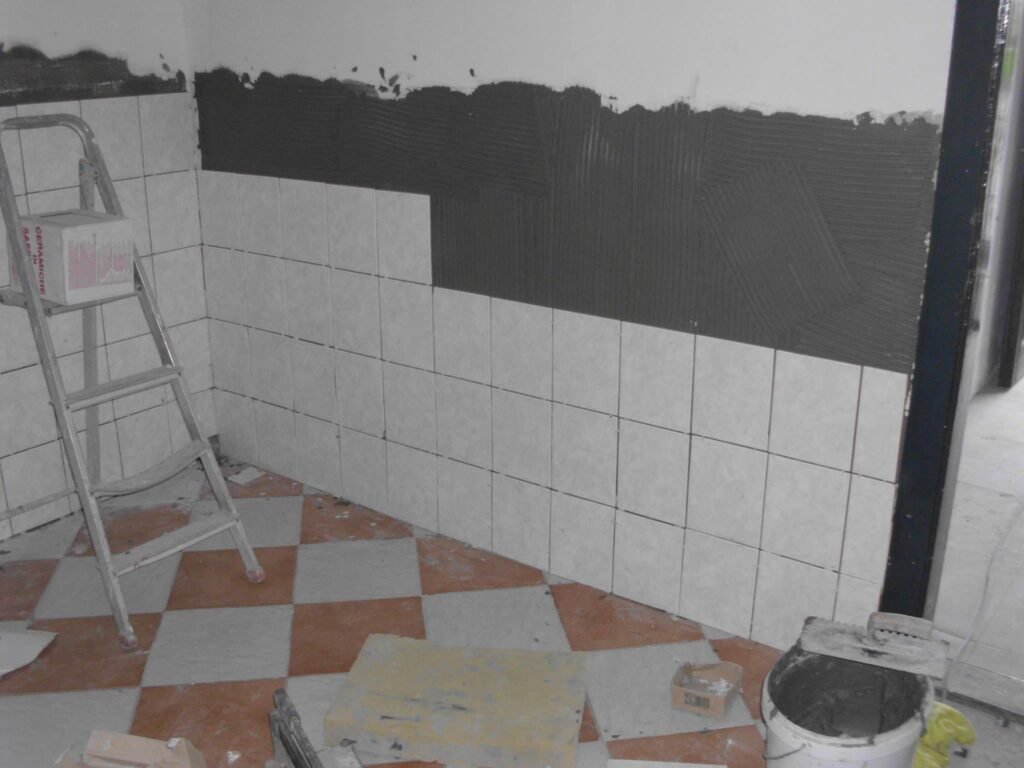 Kut u kom će se nalaziti šank. Nakon što je riješen odvod, postavljena voda, zid smo popločili na mjestu gdje će se nalaziti budući šank.