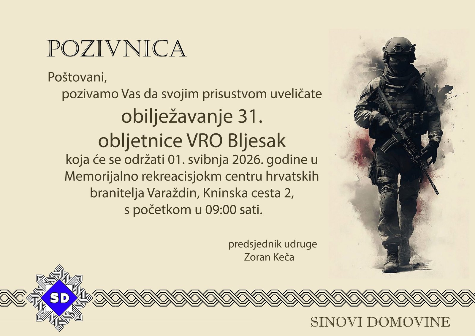 pozivamo Vas da svojim prisustvom uveličate obilježavanje 31. obljetnice VRO Bljesak koja će se održati 01. svibnja 2026. godine u Memorijalno rekreacijskom centru branitelja Varaždin, Kninska cesta 2, s početkom u 09:00 sati.