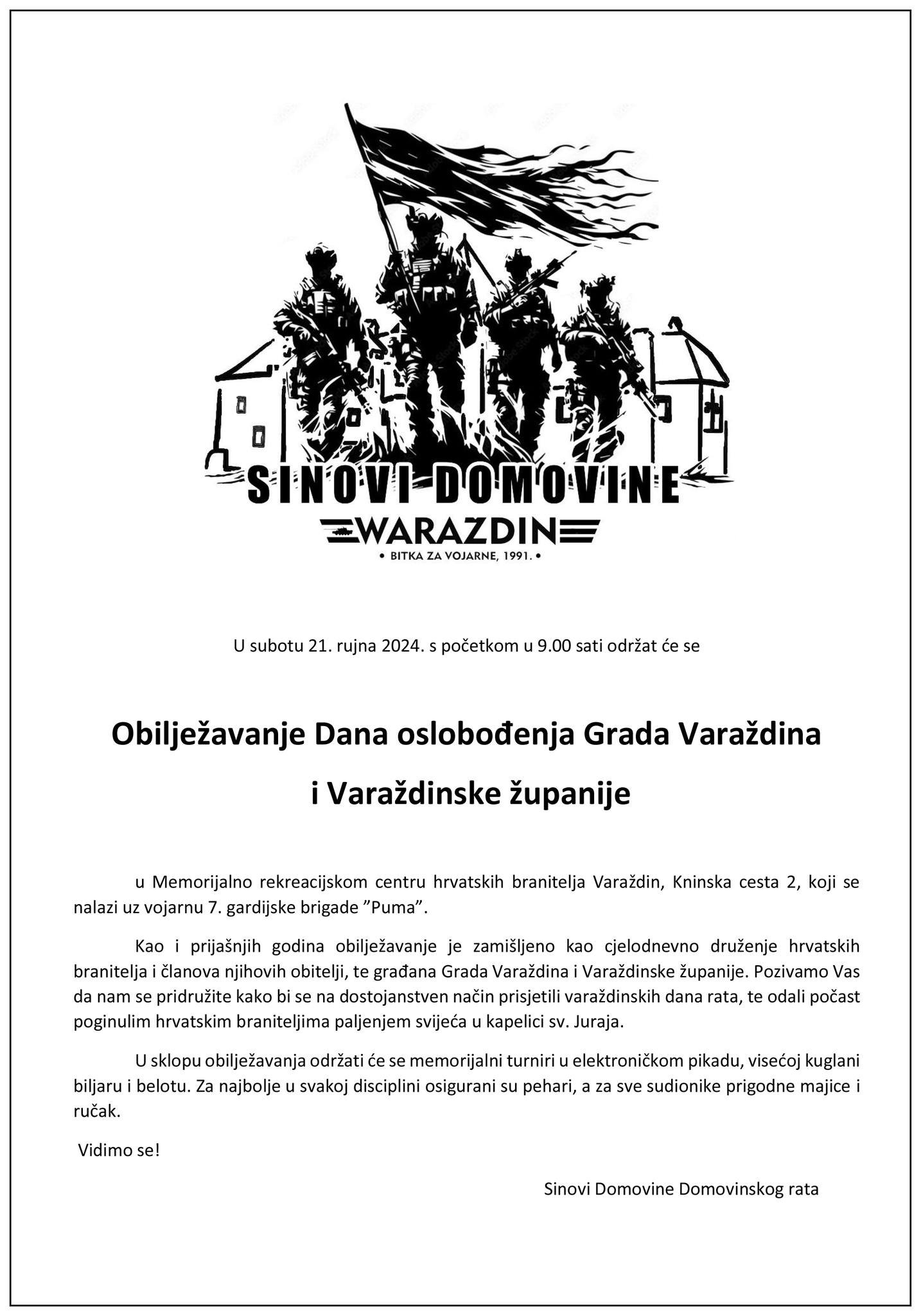 Obilježavanje 33. obljetnice oslobođenja Grada Varaždina i varaždinske županije održati će se u Memorijalno rekreacijskom centru hrvatskih branitelja Varaždin 21. rujna 2024. s početkom u 9:00 sati.